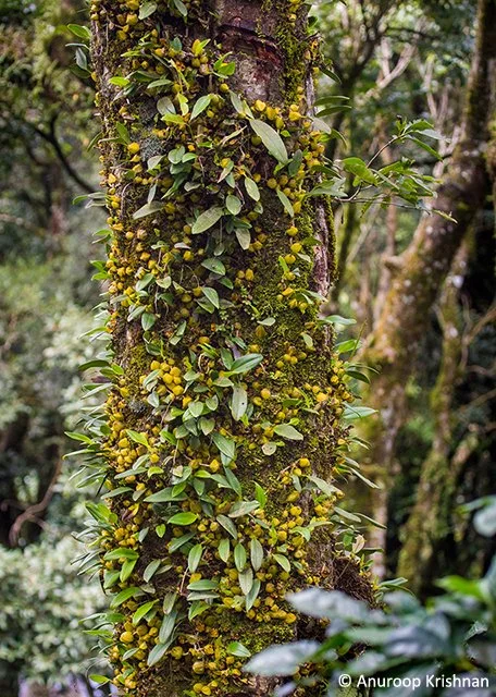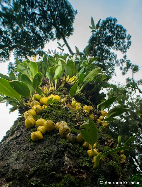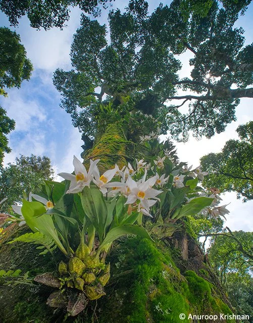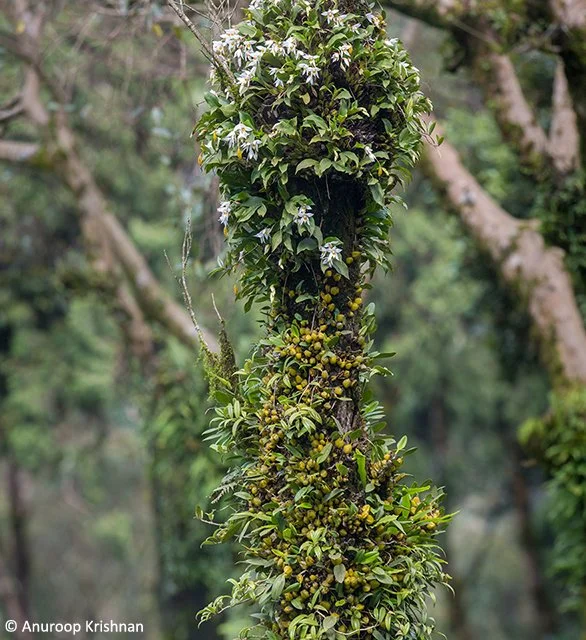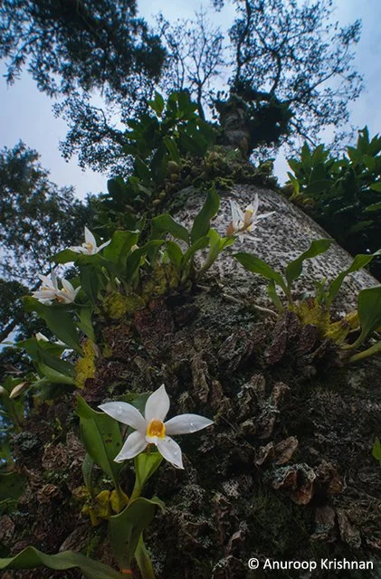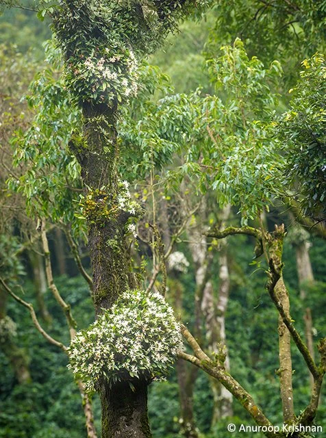 For a few weeks every year, this mosaic of forests, coffee plantations and Shola grasslands witnesses a fascinating natural phenomenon. When the monsoons are at their peak, the lush green forests are contrasted with thick carpets of yellow and white, because of the mass flowering of an orchid. A number of trees in the forests and coffee plantations alike can be seen adorned with natural bouquets of these white orchids. On some trees, the orchids grow all along the bark, extending to the very top of the tree trunk, as far as the eyes can see.