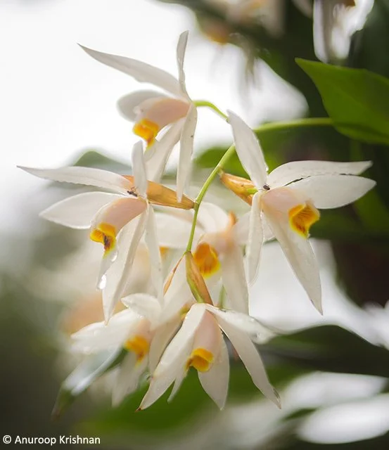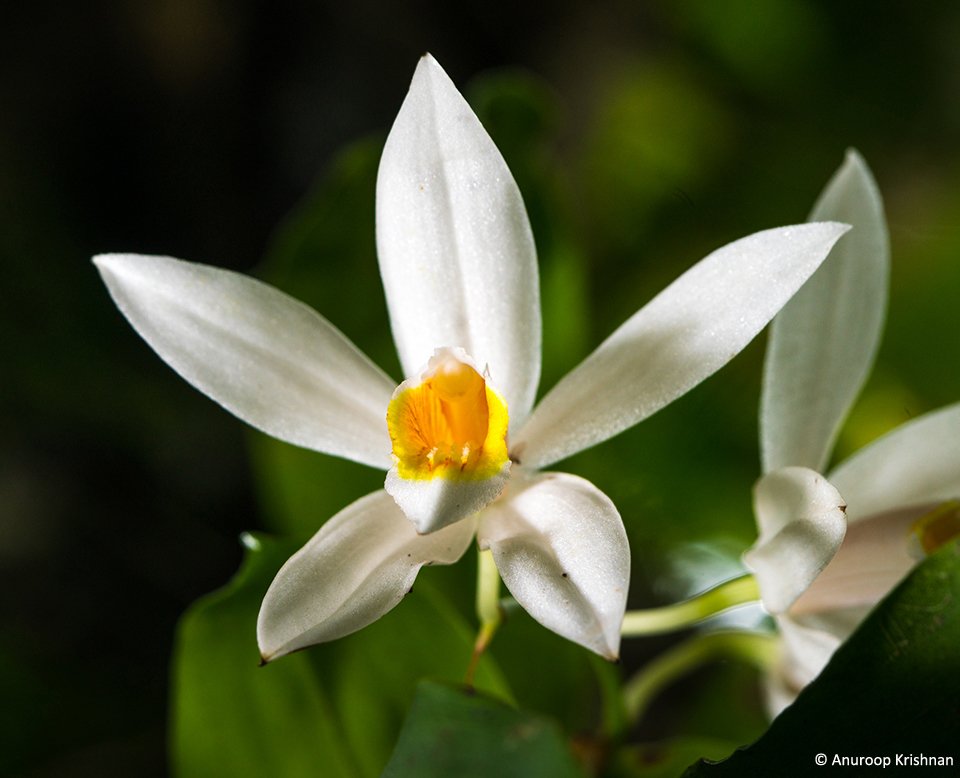 The species of orchid that blooms in these large numbers is called the Coelogyne nervosa, or the Veined Coelogyne. It is a small to medium sized epiphyte (an organism that grows on the surface of a plant and derives its nutrients and moisture from the atmosphere, using the host only for support, without necessarily affecting the host negatively) with five white petals, about 3 cm long. It has a column about 2.5 cm long, which is bright yellow in the centre. This species of orchid is an endemic species found in the Western Ghats that run through the states of Karnataka, Tamil Nadu and Kerala. It is known to flower from May through September.